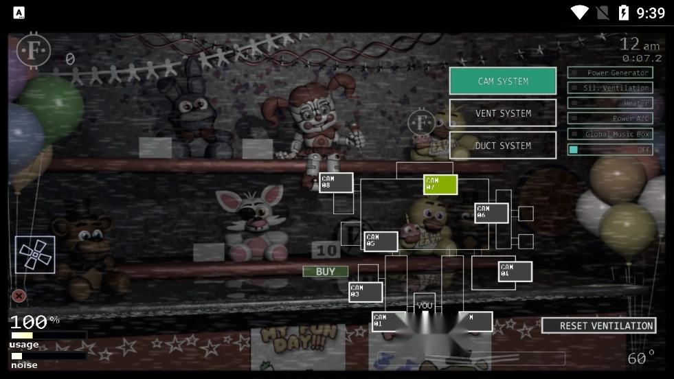 你得同时留意两个侧门、两处通风口以及两条空气软管——只要其中任何一处出现状况,都极有可能导致终结。不止如此,这次的生存挑战还加入了全新系统:操控加热器与空调来抵御环境威胁,开启发电机以保障电力供应,播放全球音乐盒来安抚幽灵,甚至能在通风道设置激光陷阱来反击入侵者。收集四处散落的Faz - Coins,从奖杯柜里兑换关键道具。而那扇极具标志性的海盗湾窗帘,你必须时刻全神贯注地盯着,哪怕仅仅有一秒钟走神,都可能引发无法挽回的后果。