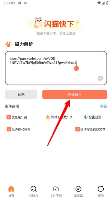 2、在主页输入磁力链接,如图所示,点击"在线解析"。