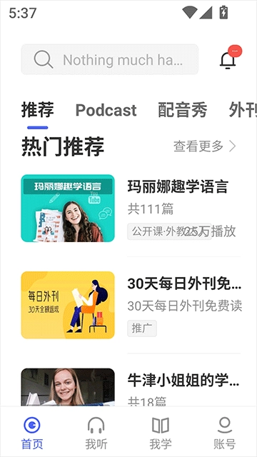 - 兴趣学习:有声读物、名人演讲、公开课、少儿英语、影视英语等丰富资源。