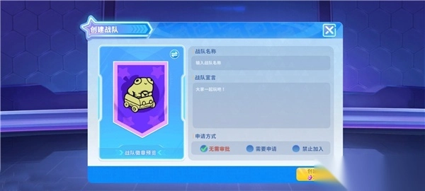 如果你想拥有属于自己的战队也非常简单!只要轻轻点击创建战队按钮,想好自己的战队名字、准备好属于自己的战队宣言、拿好100钻石,就能够拥有一个庞大的梦想了!吸纳队员、提升活跃度、经营好自己的小天地,你准备好成为明星战队的队长了吗!