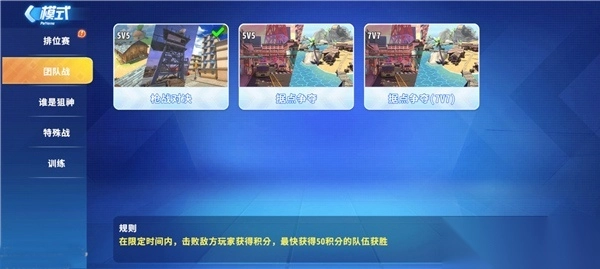 团队战有也有3种类型可以选择,5V5的枪战对决、5V5的据点争夺、7V7的据点争夺。玩法规则跟排位赛的一样,唯一不同的就是7V7的据点争夺增加了参与人数。