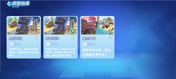1、有3种类型可以选择,5V5的枪战对决、5V5的狙击对决、5V5的据点争夺。