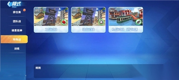 1、特殊战也有3种,分别是5V5刀战对决、5V5狙击对决、5V5枪战对决(带钩爪)。