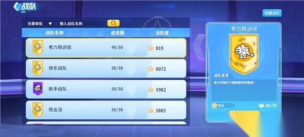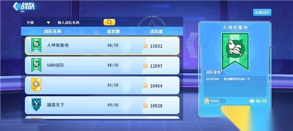 在游戏主页的战队界面中,大家可以看到各个战队的战队名称、战队成员数、战队活跃度。点击战队后,你可以看到右边的战队具体介绍,有战队宣言和申请加入的选项。大家可以多挑选几个战队,通过战队宣言里的提示去找到适合自己的战队!